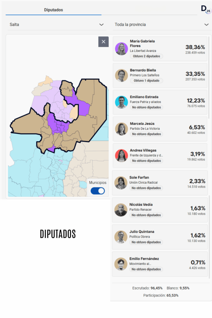 Las elecciones legislativas nacionales celebradas el domingo 26 de octubre de 2025 resultaron en un categórico triunfo para el oficialismo en todo el país. En la provincia de Salta, el partido del presidente Javier Milei, La Libertad Avanza (LLA), logró una victoria clave que consolidó su poder en la región del Norte Grande, tanto en la Cámara de Diputados como en la de Senadores.